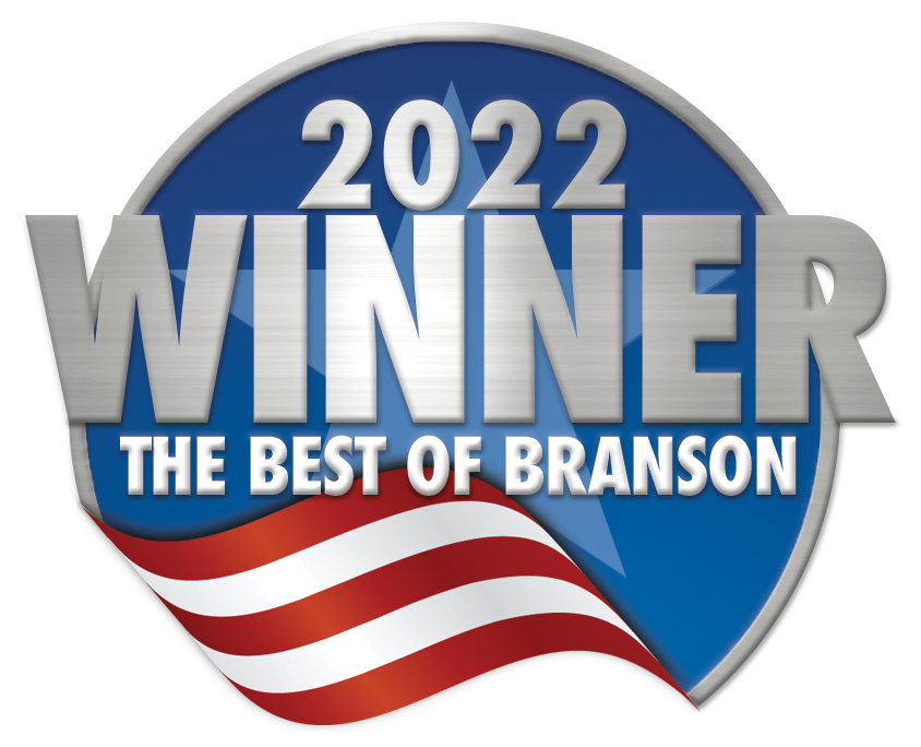 A blue shield-style award graphic reading “2022 WINNER” and “THE BEST OF BRANSON.” It features a red, white, and blue ribbon across the bottom.